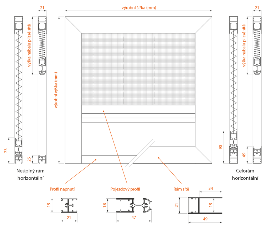 Síť je uchycena v hliníkovém rámu, který se montuje do šikminy sádrokartonu a zakrývá celý výklenek střešního okna. Samotná síťovina je plisovaná do tvaru harmoniky, díky čemuž se při ovládání plynule skládá do bočního nebo horního profilu. Při výrobě se vždy volí konkrétní směr stahování – buď svisle (nahoru/dolů), nebo vodorovně (do strany), podle dispozice výklenku a požadavků zákazníka.